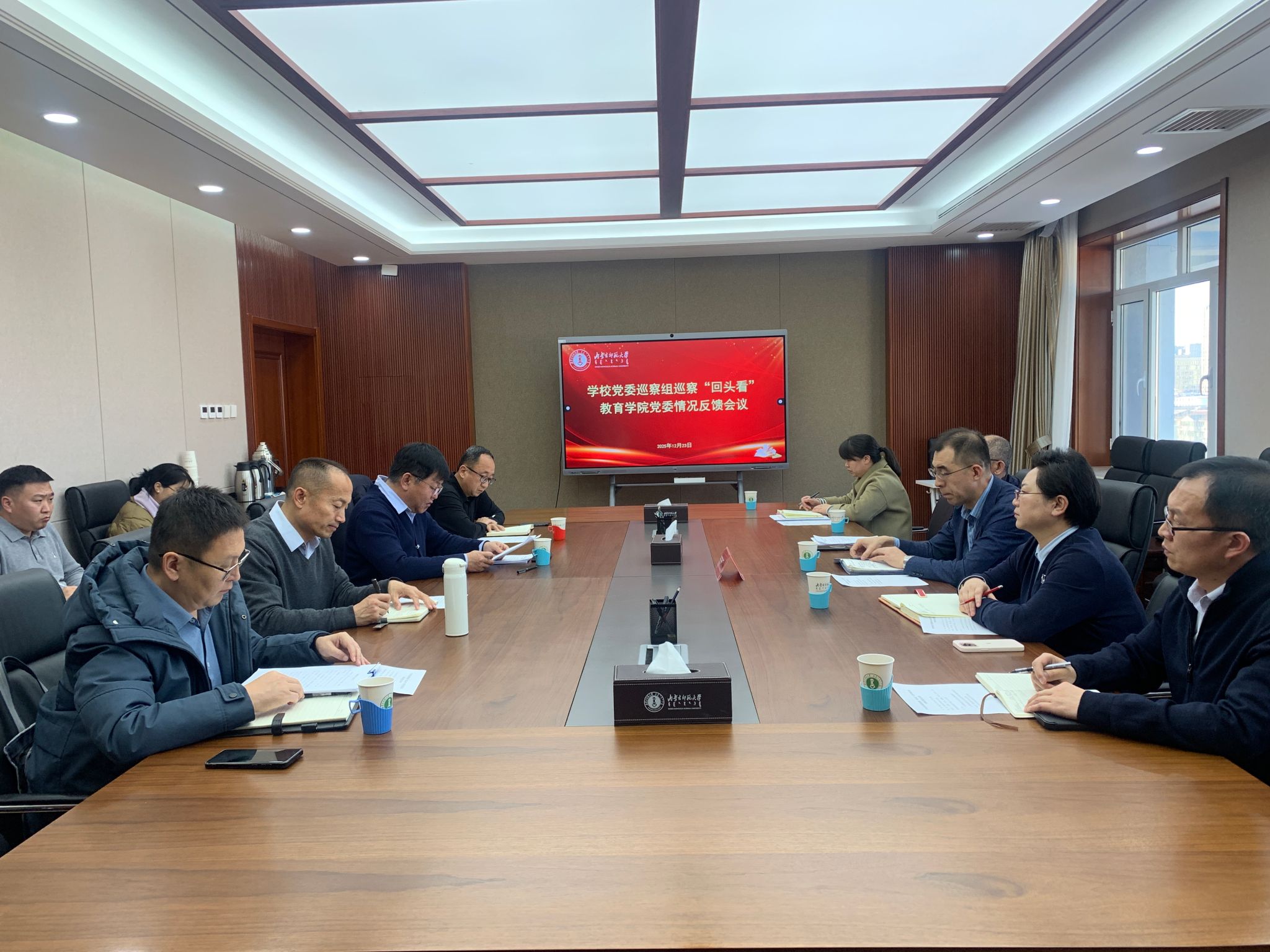 2025年12月23日下午,学校党委巡察组巡察“回头看”教育学院党委情况反馈会议在田家炳教育书院楼728 会议室召开。学校副校长景剑峰、巡察组组长李文胜、纪委副书记兼纪检监察处处长温菊花、组织部副部长刘永超、巡察办副主任张玉兰及教育学院领导班子成员、环节干部代表参会。